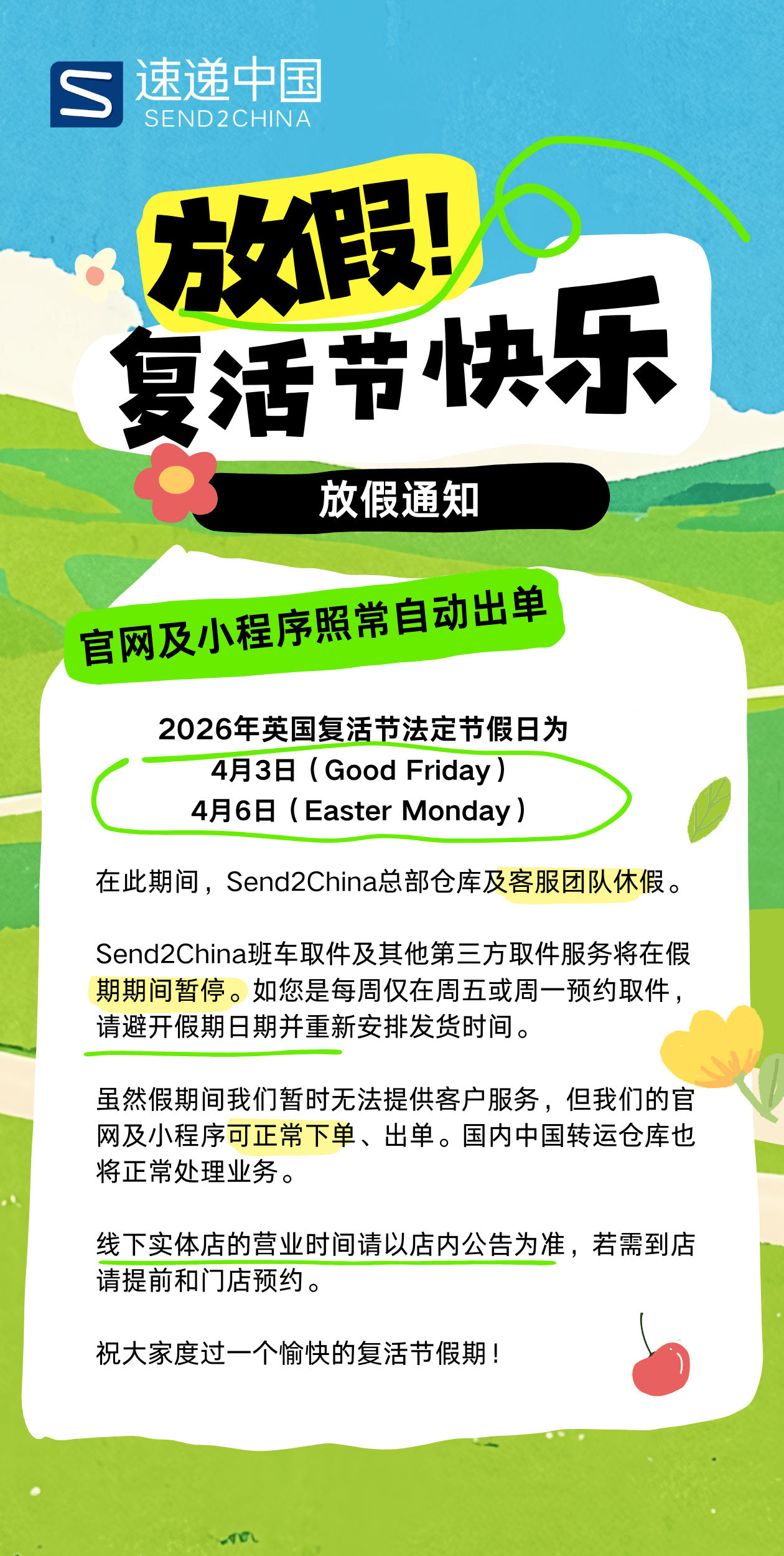 尊敬的各位用户:中秋&国庆双节将至Send2China预祝大家节日快乐!正常发货假期间,速递中国英国总仓将正常扫描包裹。用户可照常进行下单和取件预约。国内清关及派送可能因假期出现延误,请...